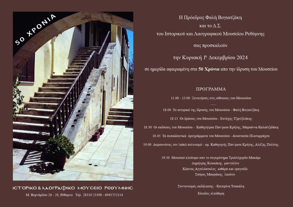 Η 1η Δεκεμβρίου 2024 ήταν μέρα αφιερωμένη στα 50 χρόνια από την ίδρυση του Μουσείου. Το πρωί έγιναν ξεναγήσεις για το κοινό στις αίθουσες του Μουσείου και το απόγευμα πραγματοποιήθηκαν ομιλίες από τα μέλη του Δ.Σ, όπου παρουσίασαν την πορεία του ολα αυτά τα χρόνια.